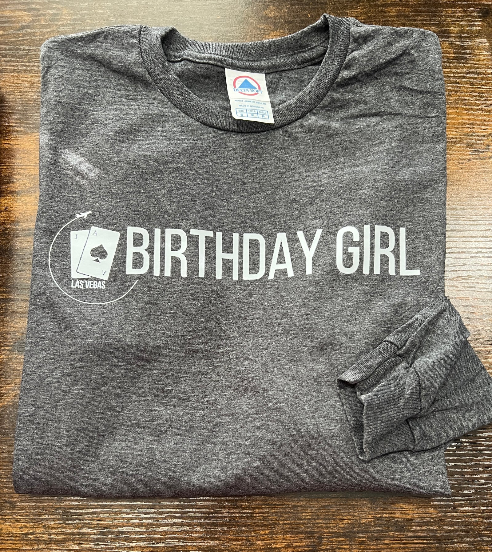 21 (Blackjack cards) with Las Vegas and airplane partial circle before birthday girl. This image is on a 50% poly/50% cotton heather charcoal unisex fit tee. Image done with DTF. (Direct to film)