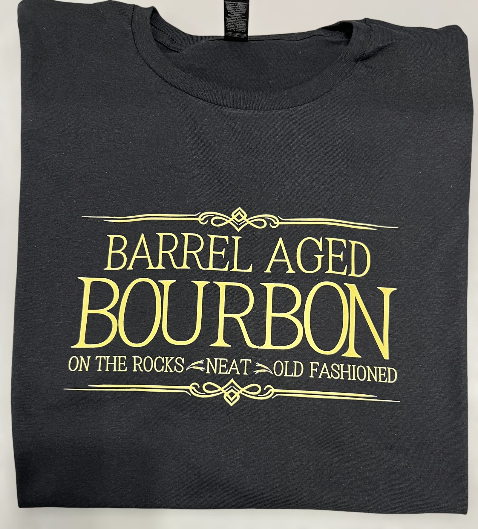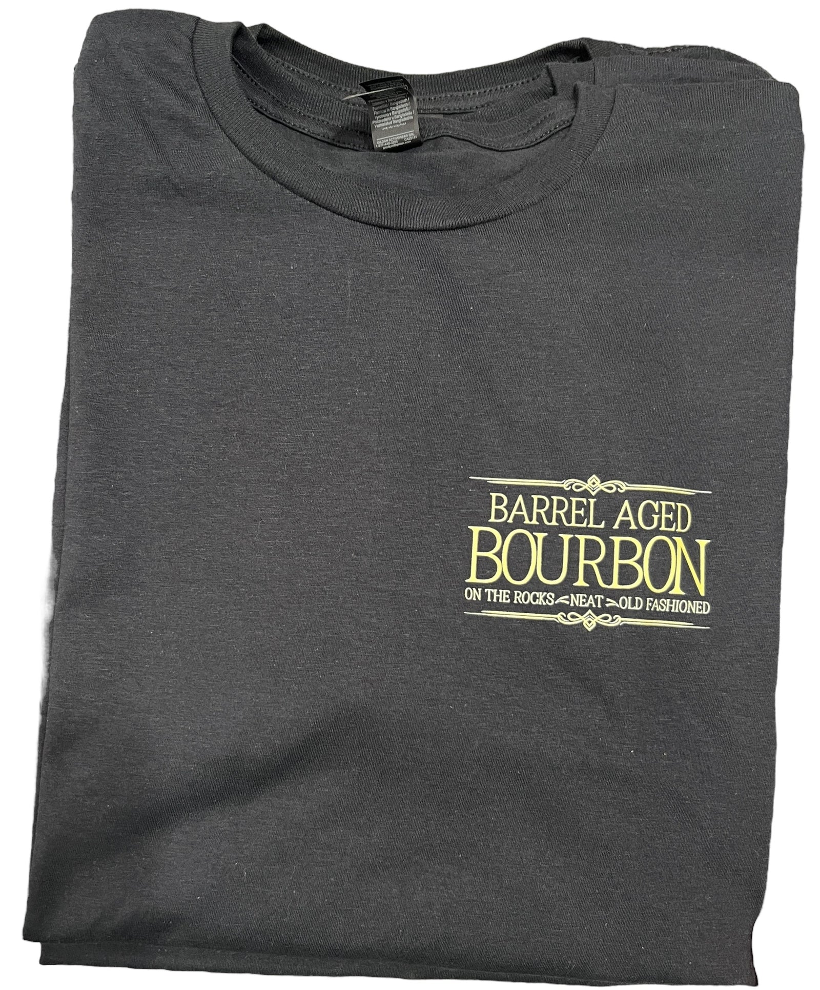 Barrel aged bourbon - on the rocks, neat, old fashioned unisex fit Gildan soft style unisex fit short sleeve tee.