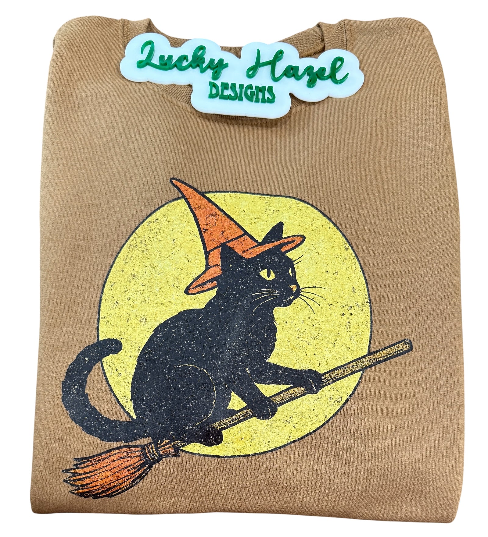 Black cat witch riding a broom image on a unisex 50/50 blend golden pecan sweatshirt.