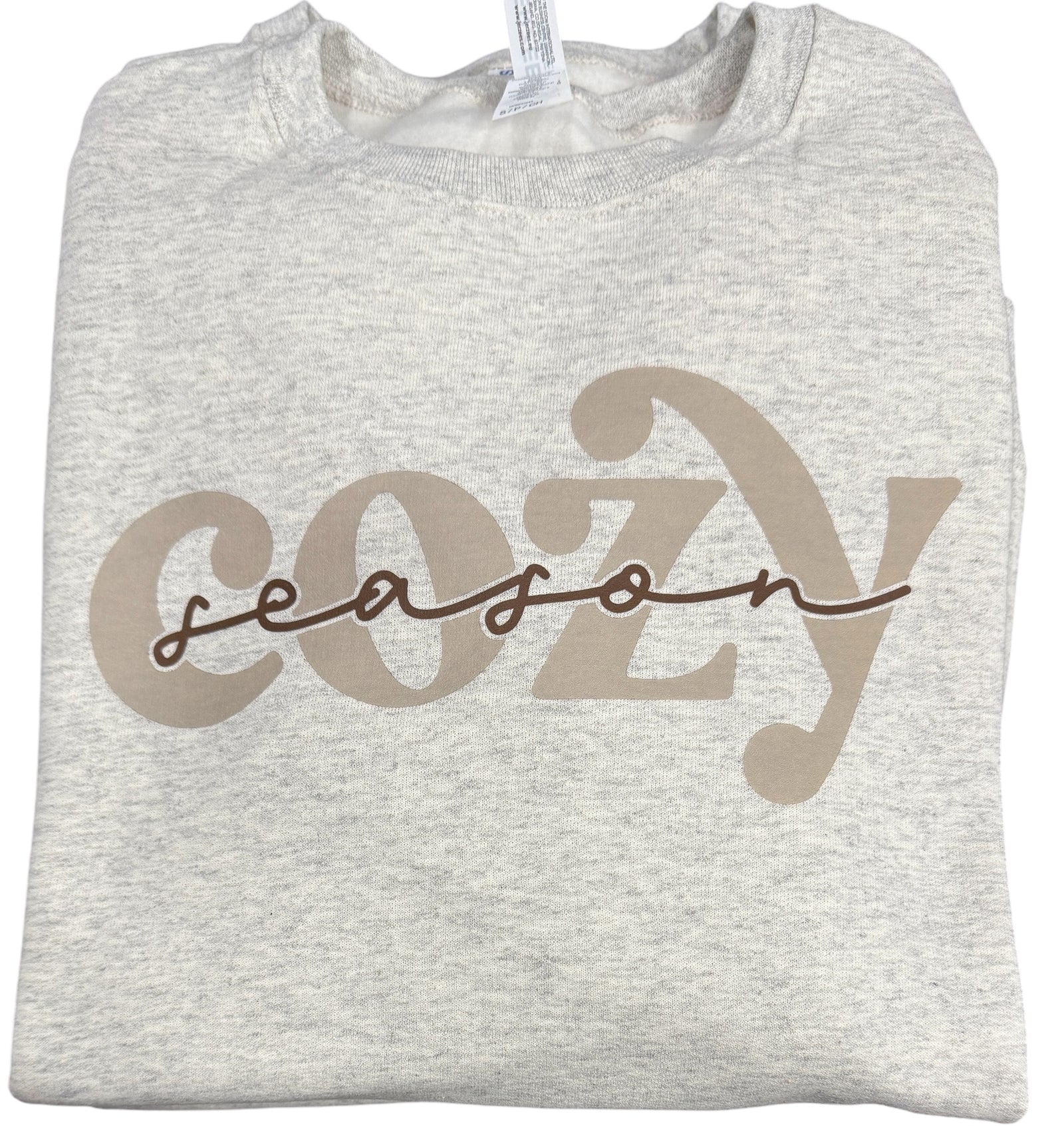 Cozy season image on an oatmeal heather, poly/cotton blend unisex sweatshirt.