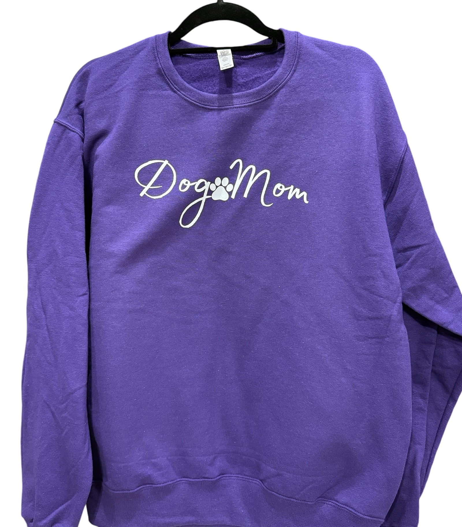 Dog mom on a unisex, poly/cotton blend, purple Hanes sweatshirt.