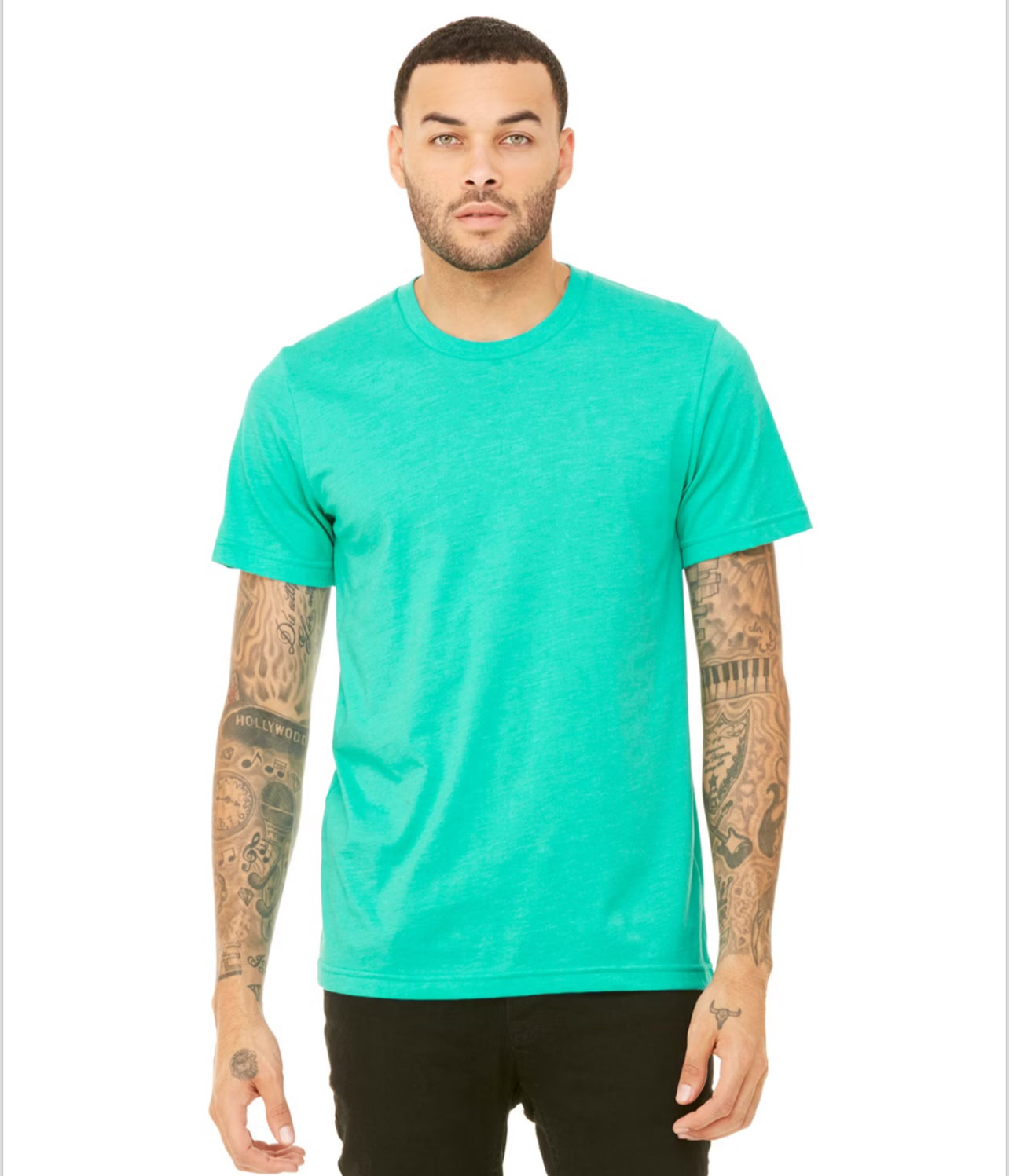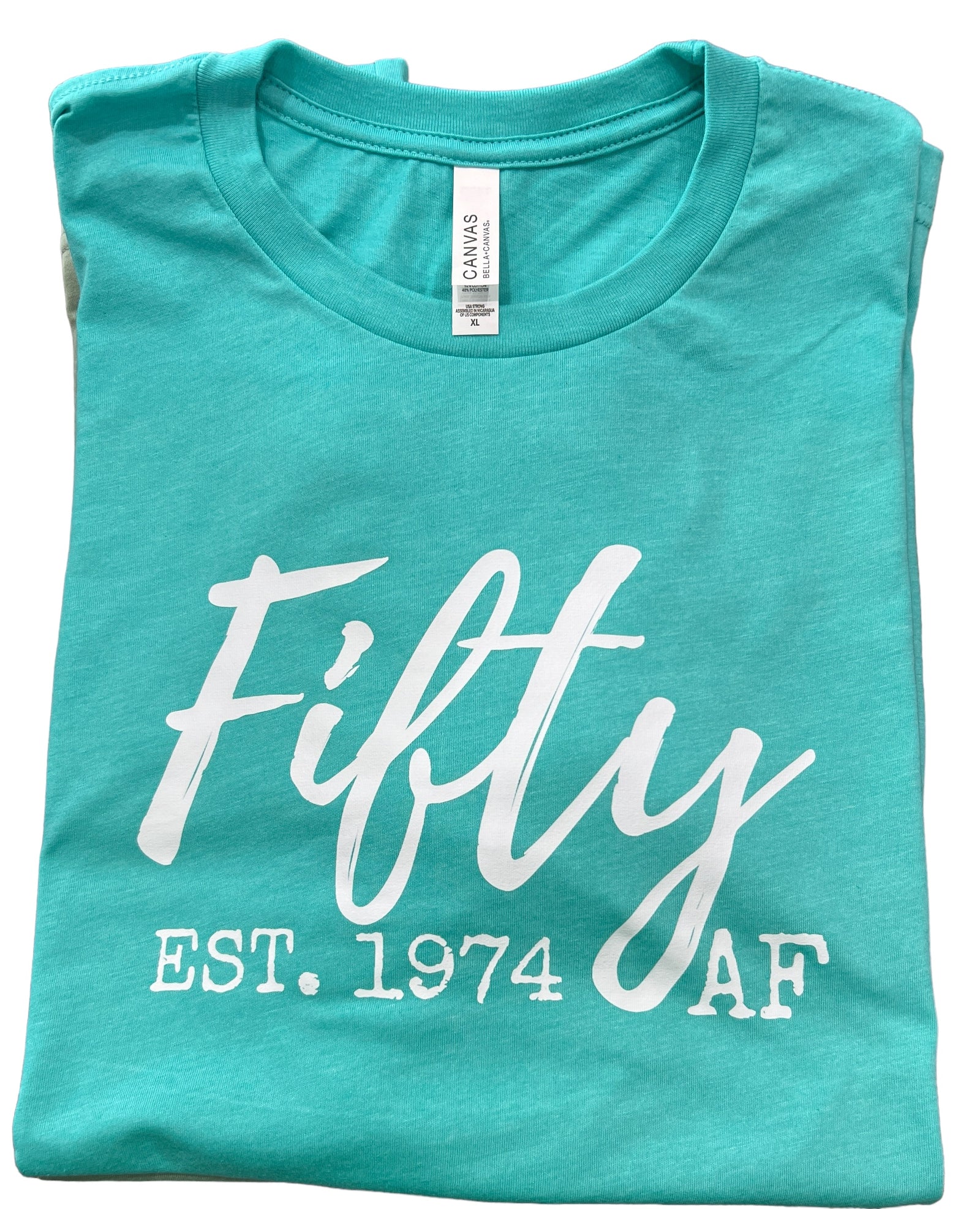 Fifty est. 1974 AF on a heather sea green Bella + Canvas 52% ringspun cotton, 48% poly, unisex fit tee.