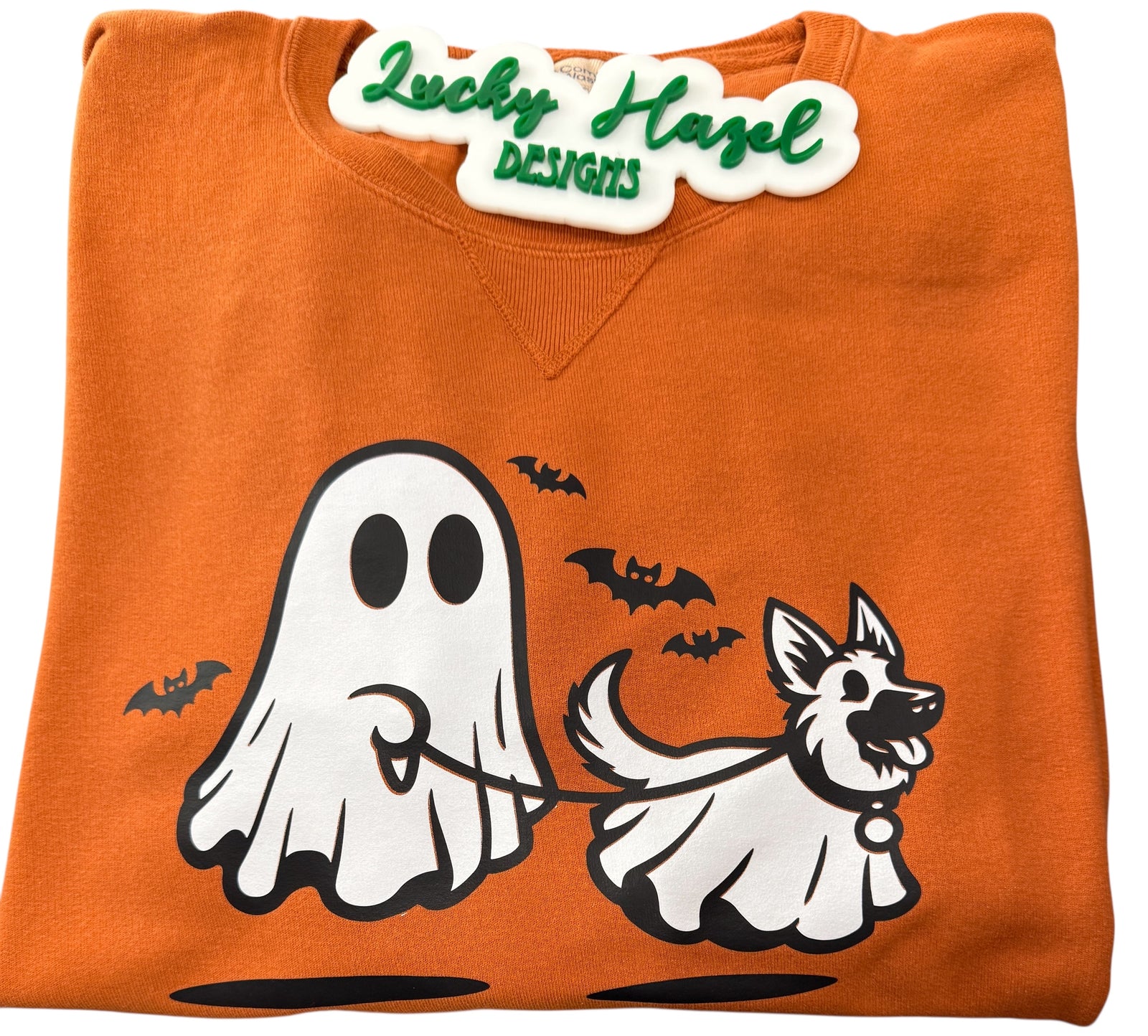Cute ghost walking a dog on a unisex 80/20 blend premium Comfort Wash orange sweatshirt.