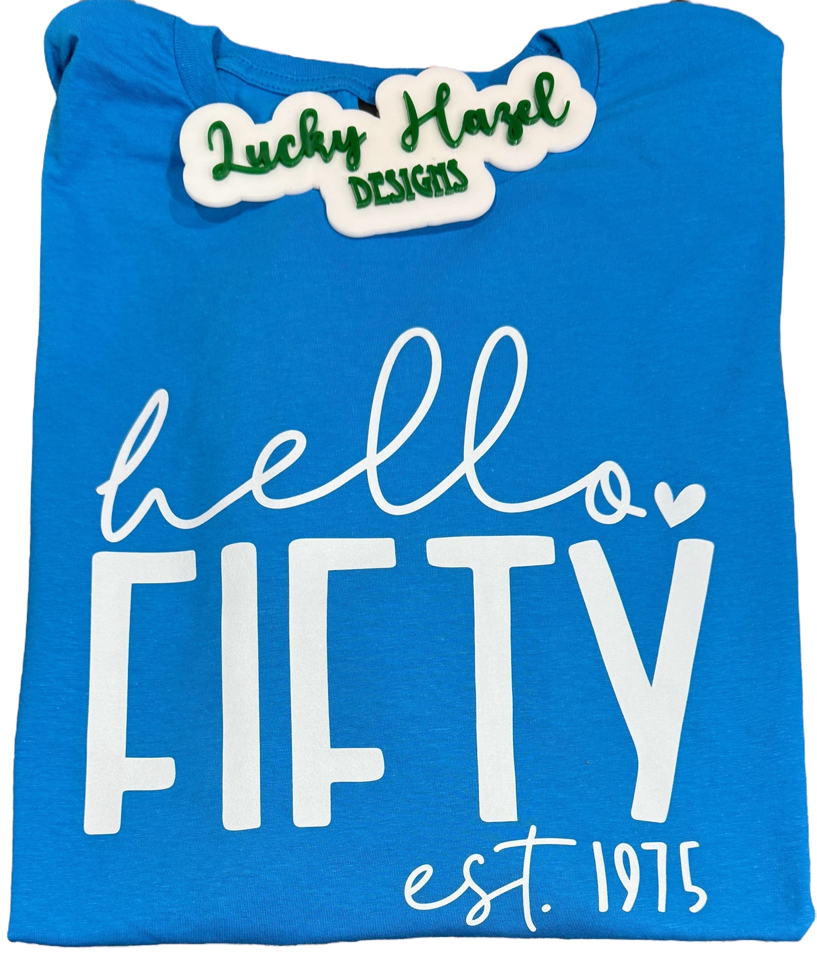 hello fifty est. 1975 in white ink on a sapphire blue short sleeve unisex Gildan softstyle tee.