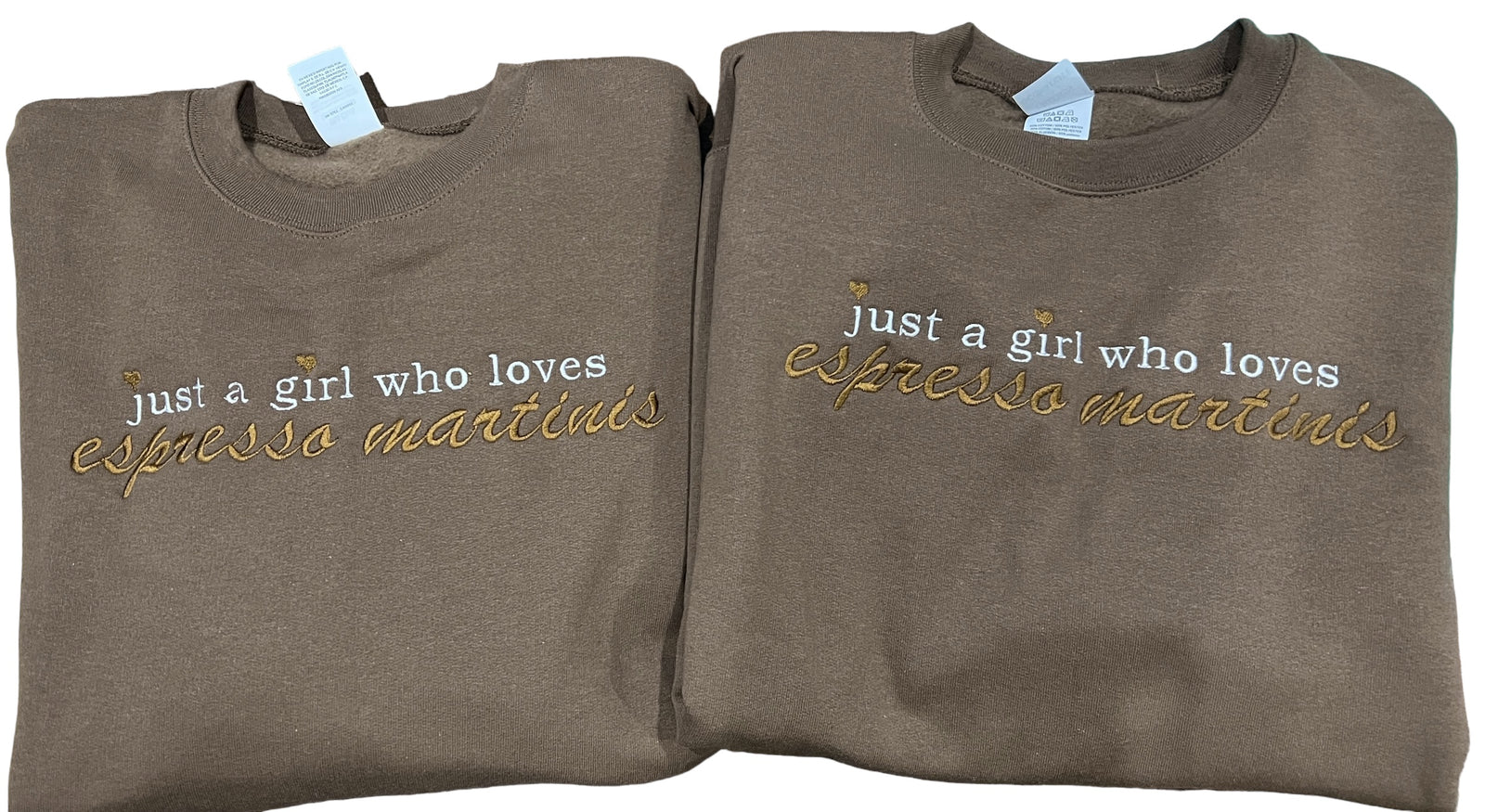 Just a girl who loves espresso martinis embroidered sweatshirt - so cute! Sweatshirts are unisex and poly blend.