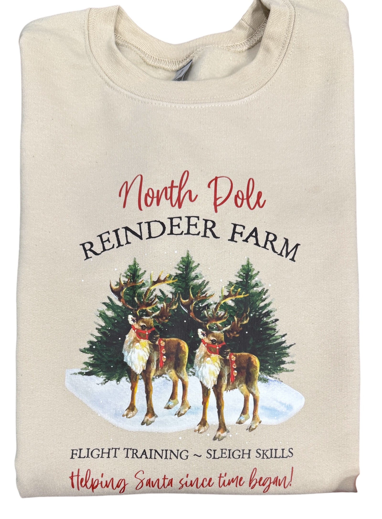 North Pole reindeer farm sweatshirt.  This image is on a sand color 50/50 unisex fit sweatshirt.