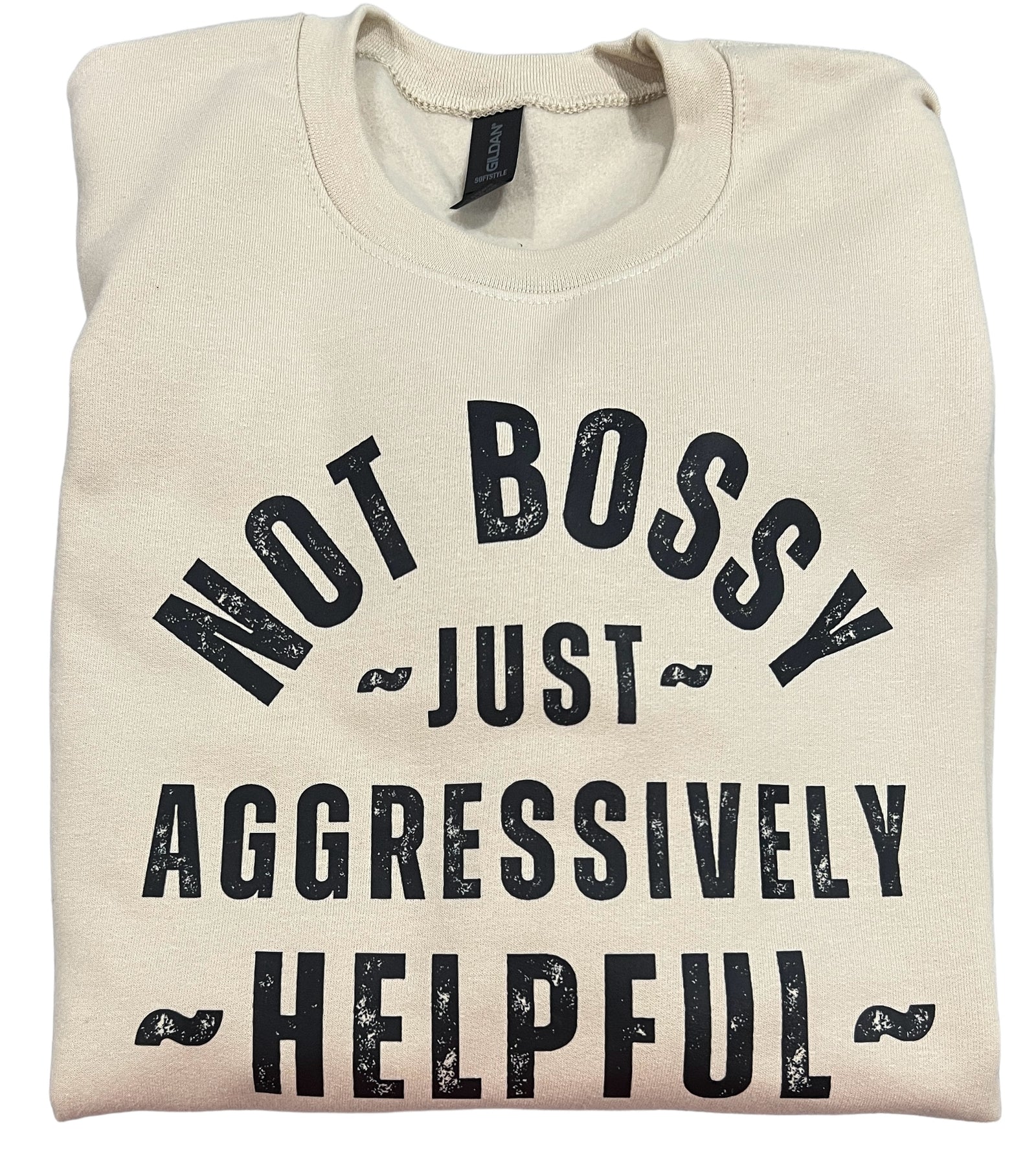 Not bossy just aggressively helpful on a sand colored soft sweatshirt.