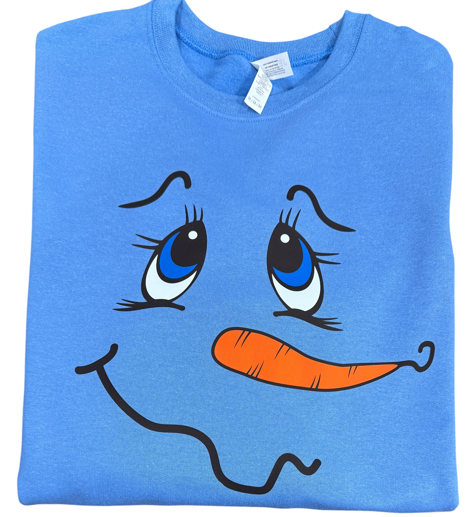 A super cute snowman face sweatshirt.  This image is on a blue 50/50 unisex fit sweatshirt.