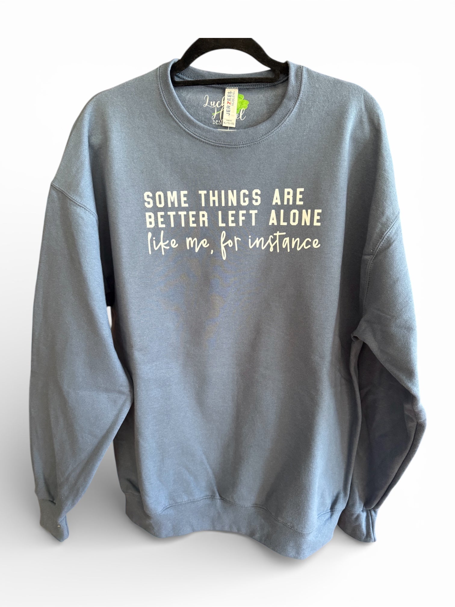 Some things are better left alone, like me, for instance on a denim colored sweatshirt. (stock photo shows the true color of the sweatshirt)