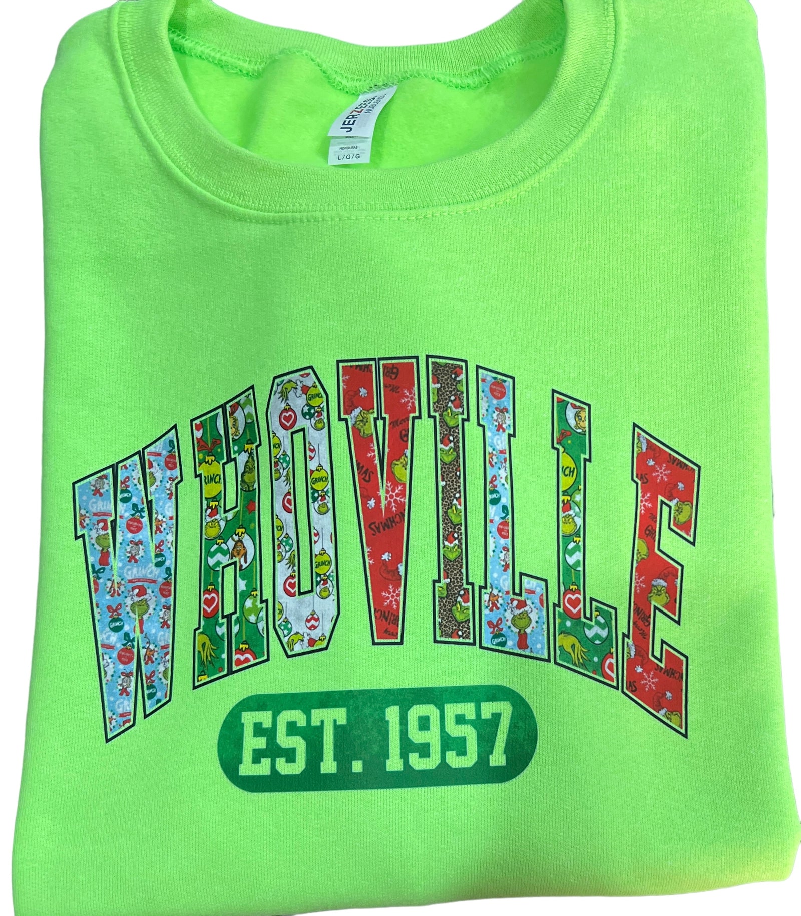 Whoville sweatshirt.  This image is on a neon green color 50/50 unisex fit sweatshirt.