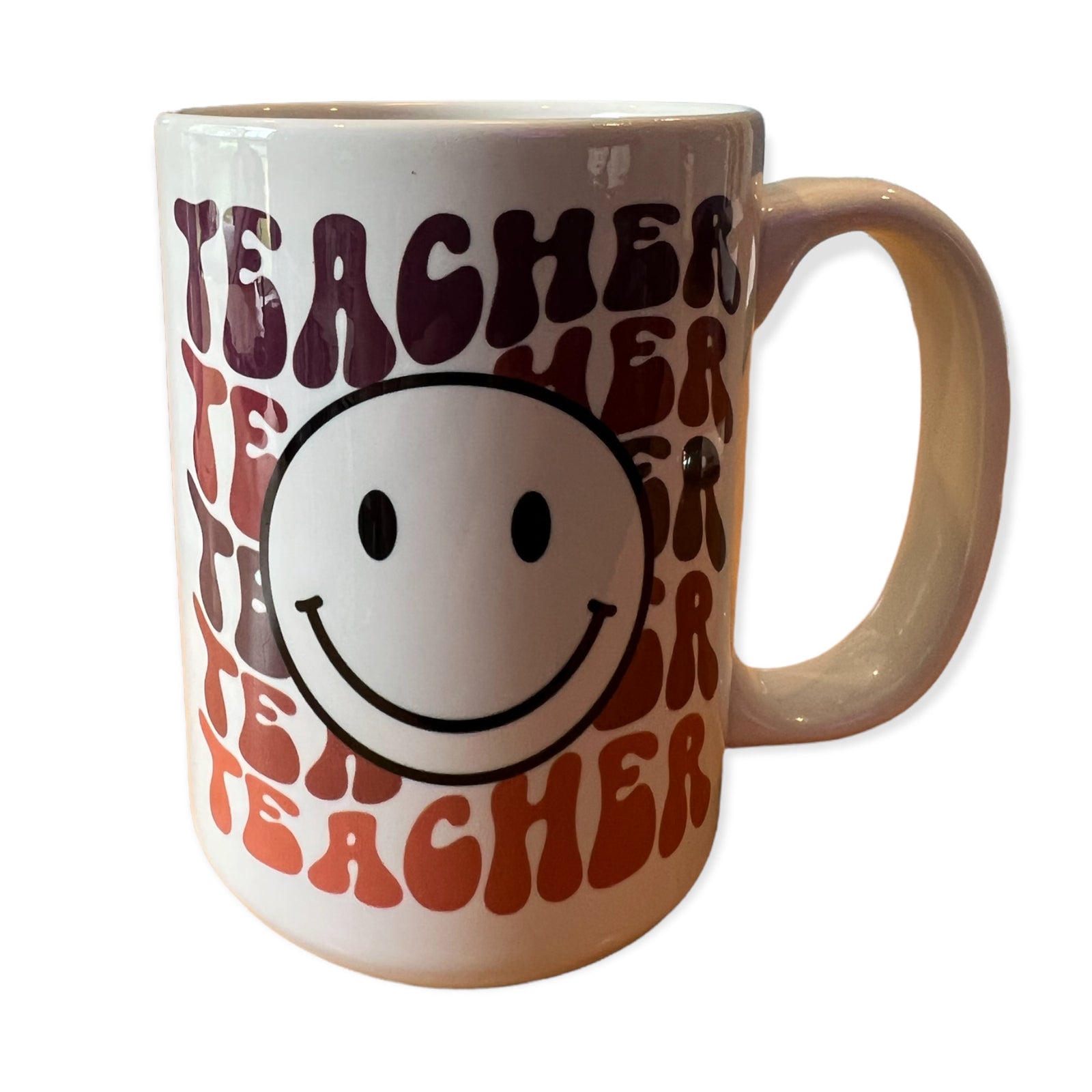 15 ounce ceramic mug, dishwasher and microwave safe.