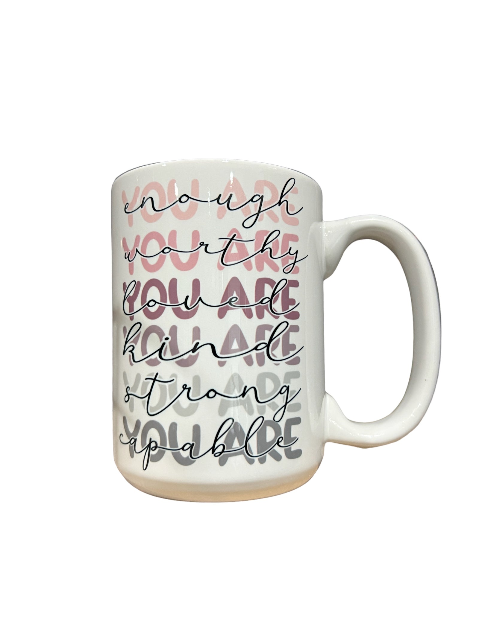 YOU ARE - enough, worthy, loved, kind, strong, capable - inspirational/self love image on a ceramic coffee/tee mug.