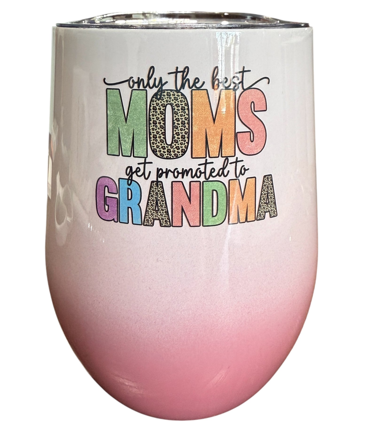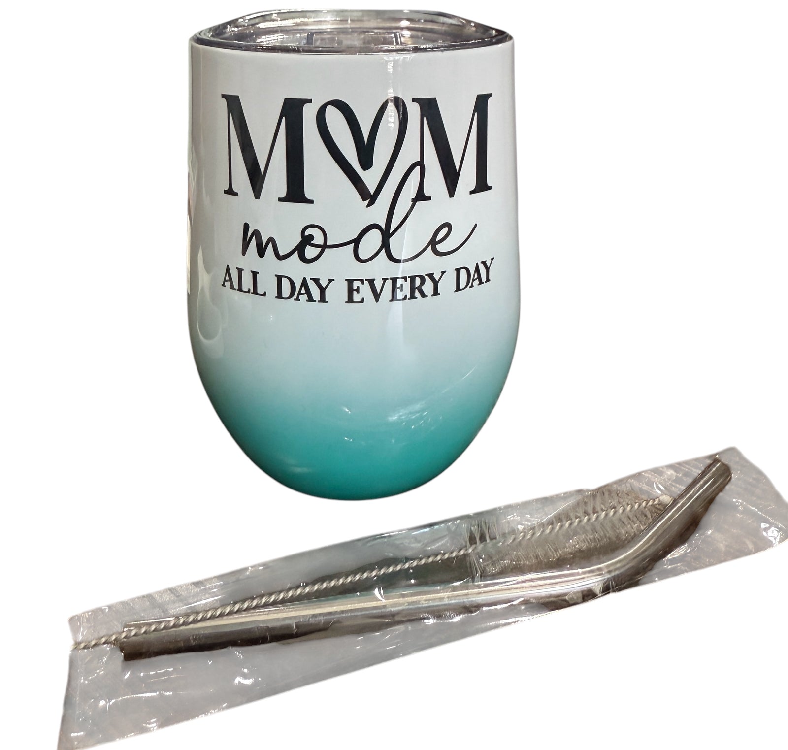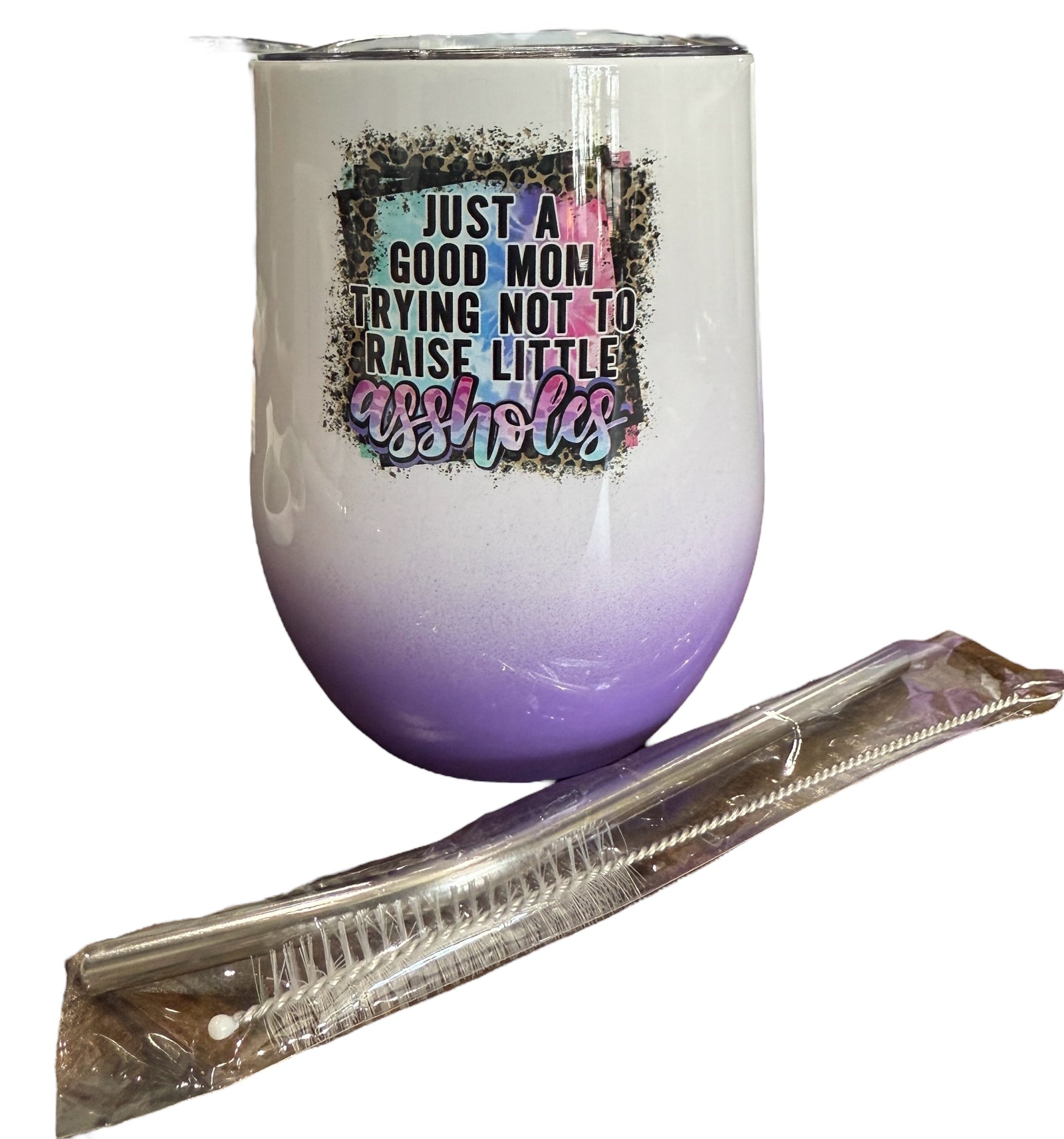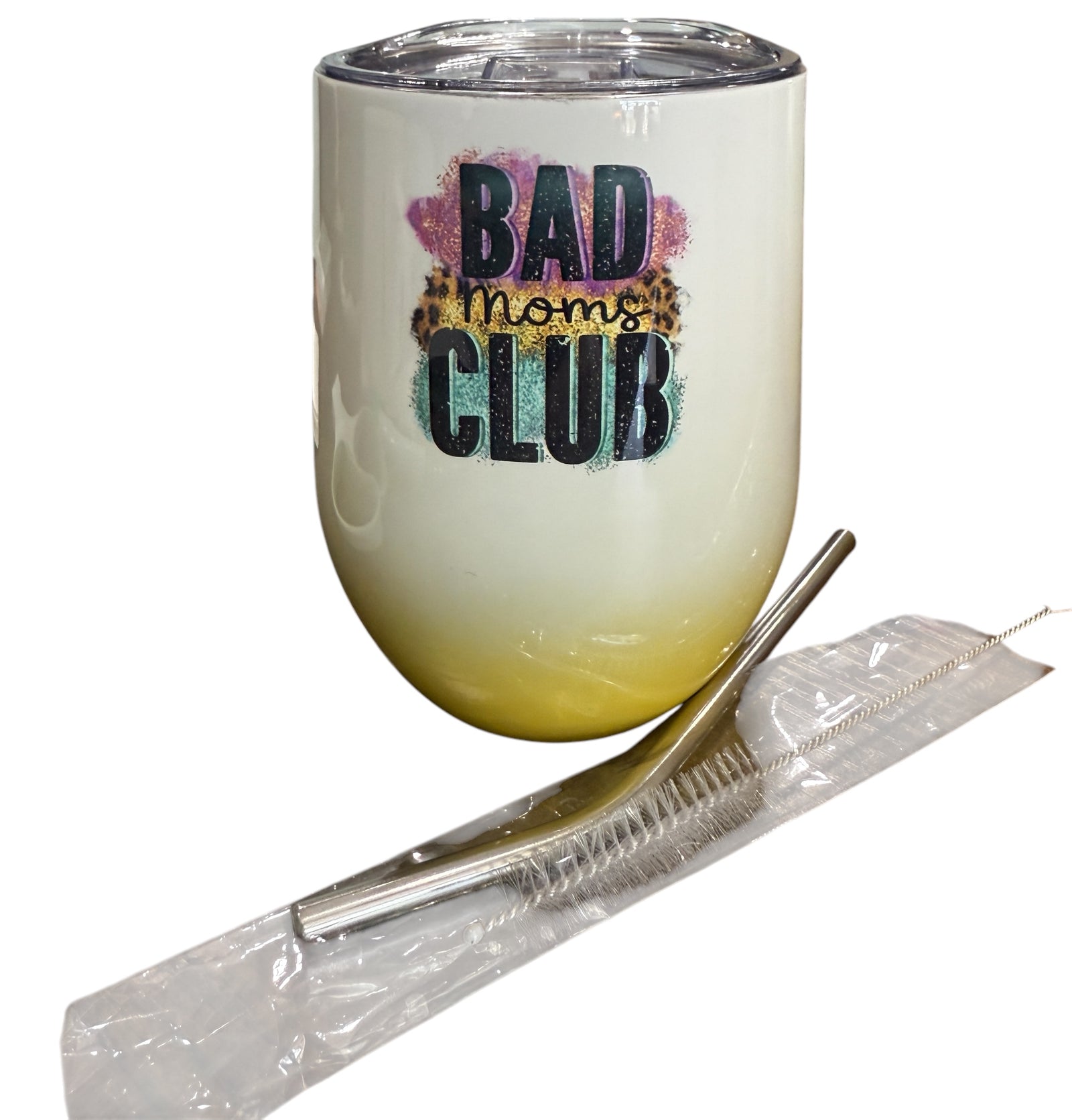 12 ounce wine tumblers (no handles) in silver, white, teal, red, and hot pink