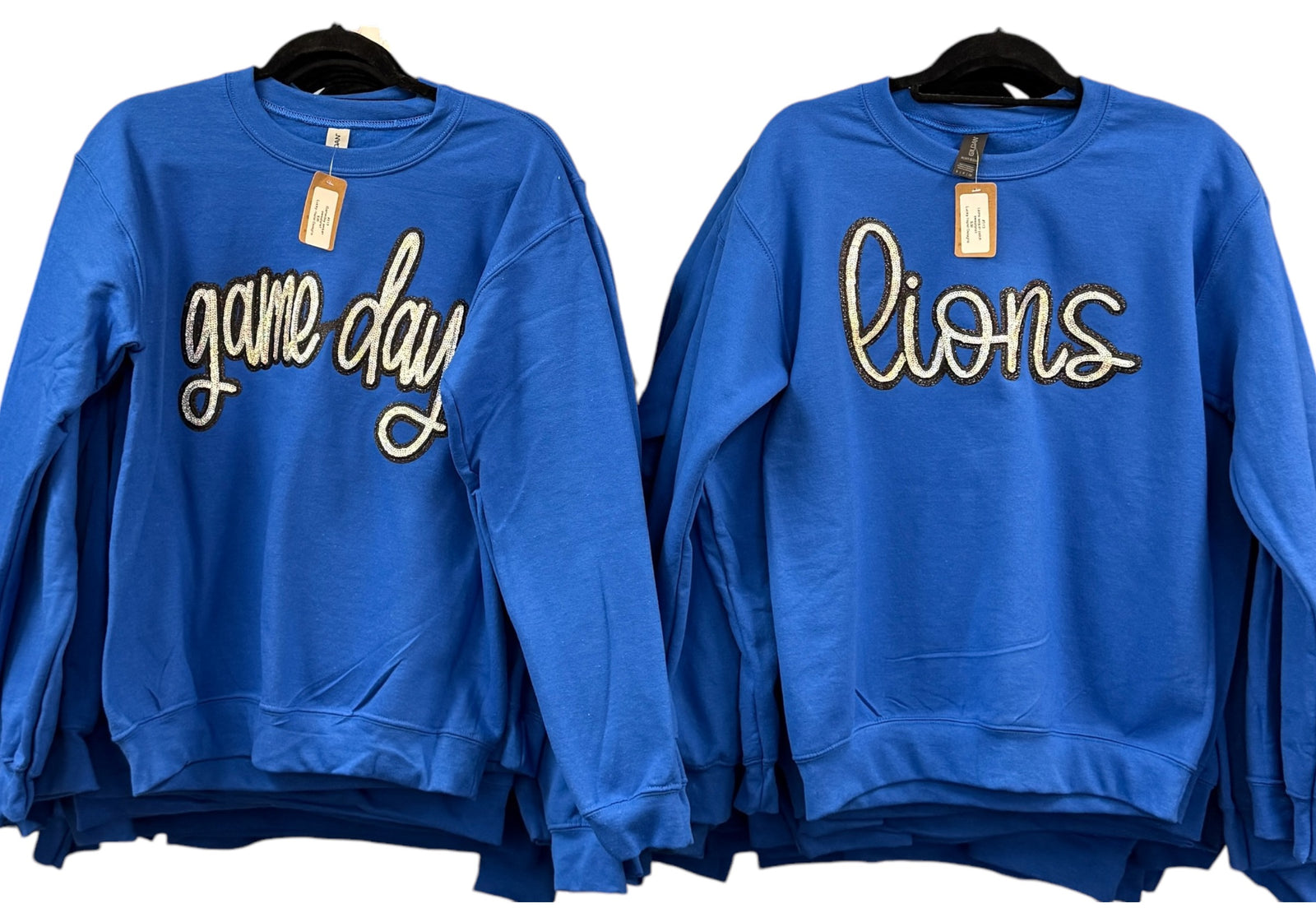 Lions sequin patch on royal blue sweatshirt!  So cute!